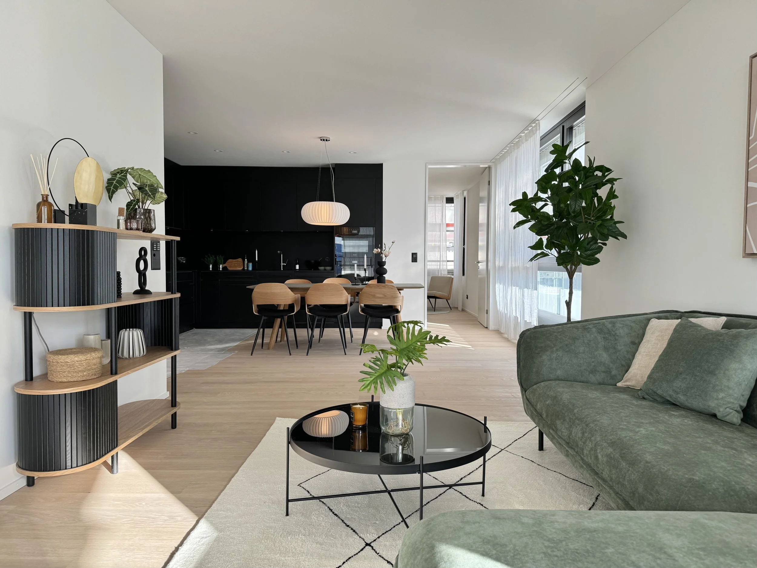 Durch die stimmige Möblierung und den Einsatz von Licht und passenenden Accessoires werden die Vorzüge der Musterwohnung perfekt unterstrichen.